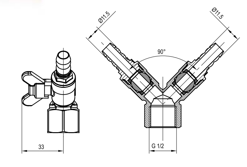• هيكل مدخل واحد ومخرجان: مدخل بخيط ذكر واحد مع منافذ مزدوجة لشوكة الخرطوم، مما يسمح بالتزويد المتزامن لجهازين، مما يقلل من تفرع خطوط الأنابيب ونقاط التسرب.